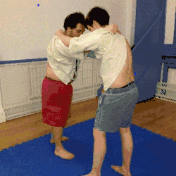 - The thrower moves their dominant foot in front of the throwee's dominant foot while pulling up the throwee's arm and tucking their dominant elbow into the throwee's armpit (keeping hold of the grips on the jacket).