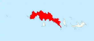 Coronation Island is the largest of the South Orkney Islands, 25 nautical miles (46 km) long and from 3 to 8 nautical miles (5.6 to 14.8 km) wide. The island extends in a general east–west direction, is mainly ice-covered and comprises numerous bays, glaciers and peaks, the highest rising to 1,265 metres (4,150 ft).[1]