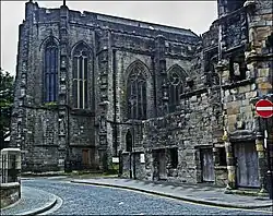 At the start of the proceedings in the church Lord Lindsay and Lord Ruthven declared on oath that Mary had "resigned willingly without compulsion."[13] The Earl of Atholl carried the crown of honour, the Earl of Morton, the sceptre,[14] and the Earl of Glencairn carried the sword of honour.[15] Morton pronounced the coronation oath on behalf of James,[16][17] the traditional ending of the Scottish coronation service.[18]