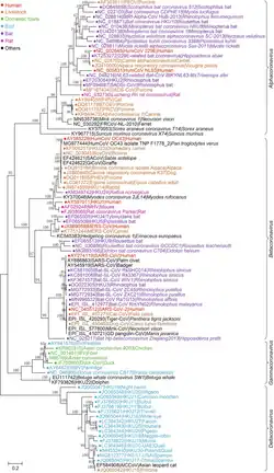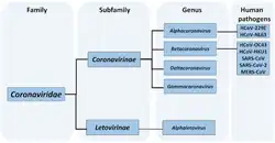 The family Coronaviridae is organized in 3 subfamilies, 6 genera, 28 sub-genera, and 54 species.[7] Additional species are pending or tentative.[8] The subfamilies and genera of the family are listed hereafter (-virinae denotes subfamily and -virus denotes genus):[7]