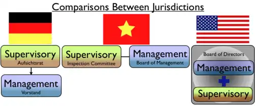 Internal governance structures are important in supervising the company managers. In US, the supervisory body is often subsumed within the single-tiered board of directors, whereas in Vietnam, the IC is an independent body. Through separation of supervisory and management functions, the Vietnamese corporate law model, at least theoretically, ensures that the BOM is held to a greater degree of accountability by an independent checking mechanism. However, there is no hierarchy for the Vietnamese IC and BOM. This contrasts with the German two-tiered board model for SCs, with an Aufsichtsrat (supervisory board) which is hierarchically superior to the Vorstand (management board). Because the IC is not recognised as a superior institution, it has limited authority over the BOM. In practice, many supervisors are low level employees within the company. Although institutionally independent, the members of the IC are, in reality, dependent on their employers for their livelihoods, and therefore serve as a weak check against mismanagement by the BOM or Director.