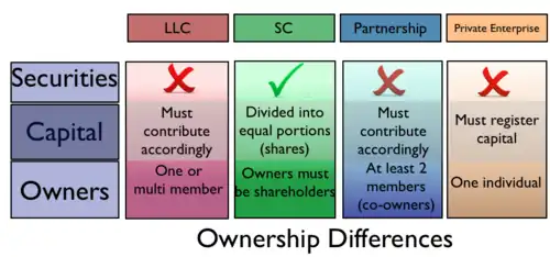 An SC is an entity with at least three shareholders,[15] where ownership of the firm depends on the number of shares they hold. It is the only form of enterprise that can issue securities to raise capital.