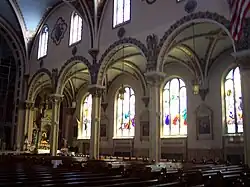 Completed in 1907, Corpus Christi's imposing facade is wrought of Hummelstown brownstone quarried in Dauphin County, Pennsylvania.[3][4] The church has 3 large bells, all in the north tower. The largest bell dates to 1898, the smaller bells were installed in 1948. All were cast by the Meneely Bell Foundry in Troy, NY. The crosses atop the towers were filled with letters from the parish's school children before they were affixed to the cupolas. The original church windows were made by Franz Mayer works in Munich, Germany.[5]