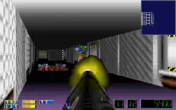 The player can activate the proximity map in one corner of the screen, showing a small section of the current level with active aliens marked in yellow. The map can be expanded by finding the floor plan. The player is equipped with a visor capable of both infrared and night vision. Infrared is employed to detect invisible traps, while night vision enhances the player's vision in dark areas of the game. Ammunition and health are not scattered around the levels as objects to pick up, but rather as dispenser bays encased in the level walls. Health is also available in rooms called "health chambers", where the player can obtain up to 100 hit points. There are two ammo types for human firearms and alien firearms.