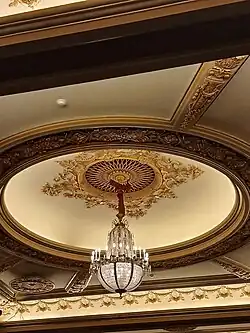 The ceiling is divided into three rectangular sections, which are recessed coves. The ribs of the ceiling, which separate the coves, are decorated with swags and wreaths. The center section contains a circular dome, which has a frieze extending outward, as well as an overhanging bronze and crystal chandelier at the center. Three additional panels, similar in design, hang over the second balcony.[36]