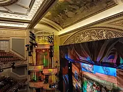 On either side of the stage is a wall section with two boxes each at the first and second balcony level.[32] Each wall section is flanked by Adam-style panels. The boxes themselves are curved and contain latticework and cameo decorations on the front railings. Under each box is a molding and a medallion holding a chandelier. Above each pair of second-balcony boxes, there is an eared architrave, as well as a latticework panel that depicts female figures flanking swags and a cartouche.[35] Originally, the auditorium had twelve boxes (four on each level),[13] but the boxes at orchestra level were removed.[32] Instead of an orchestra pit, there was a Wurlitzer organ that a single musician could operate.[13][8] The organ was an Opus 20 model with three manuals and thirteen ranks.[37]