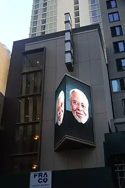 The western annex, measuring 35 feet (11 m) wide, was built between 2021 and 2022.[11][12] The annex is about 74 feet (23 m) tall, with five stories; the elevator shaft in the annex rises to 80 feet (24 m). A recessed brown-granite bay at the end of the alley connects the annex and original theater.[21] The annex's elevator shaft is about 30 feet above the roof of the original theater.[22] Unlike the original facade, it has a modern design with cream-colored terracotta facade panels interspersed with polished brownstone pieces.[14][23] There are glass display boxes at ground level, as well as a glazed window at the eastern corner of the annex's upper stories.[24] There is also an LED sign on the exterior of the annex's upper stories.[22][25]