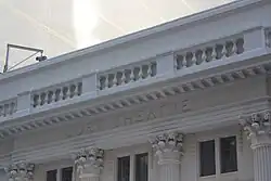 The central pavilion contains four fluted engaged columns with Corinthian-style capitals.[15][13] At ground level, each of the three center bays contains a set of double doors made of glass and aluminum, above which is a marquee.[15] The original marquee had three Art Nouveau arches,[14] but it was replaced in the 20th century with a boxy structure with signs on either side.[15] A new marquee, similar in design to the original, was installed in 2021;[11] it contains three arches framed by metal shield decorations, as well as four spherical lamps hanging from the marquee.[14] Above the marquee are arches topped by bracket-shaped keystones. A transom bar runs horizontally above the keystones, above which are slightly recessed pairs of windows, flanked by bellflowers.[15]