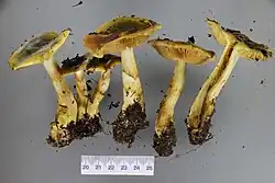 Cortinarius alienatus can have hemispherical caps,[3] or caps which are convex that become broadly umbonate, often with a slimy[3] or glutinous texture.[6] Cap diameter of Cortinarius alienatus is 20–70 mm (0.8–2.8 in).[6] Cap colour tends to be olivaceous[3] but can vary between olive-yellow and olive-grey.[6] The cap commonly has a darker olive-brown, olive-green, or even blackish disk at the centre.[6] The outer edge of the cap is a paler olive-tan colour.[6][3] The cap is not hygrophanous and the colours do not fade significantly when dried.[3][6] The gills of Cortinarius alienatus tend to be thick[3] and yellow-green to citrinous in colour,[6] the same colour as the internal flesh.[6] The flesh bruises brown[3] and has a faintly raphanoid odour.[3][6] The stipe is also yellow to citrinous or grey-citrinous in colour,[6] covered in a texture resembling small thread-like fibres.[3] The veil of Cortinarius alienatus appears sparsely and is slimy or glutinous in texture[6] and yellow-green to olive-brown in colour.[3][6]