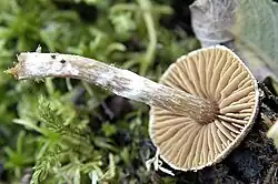 The cap is 2–4.5 cm (0.8–1.8 in) wide, convex, with a flattish or more pointed umbo (occasionally the umbo may be lacking), watery date brown, hygrophanous. In damp weather the cap surface is almost chestnut brown in young specimens, in dry weather grayish-brown to tan brown. The surface is soon silky and the margin almost white from floccose, white fibrils (these are easily washed off by rain), otherwise only very slightly whitish fibrillose, finally even bare. When the tip of the stem is hollow, the cap which is thinly fleshy and quite tough. The gills are distantly spaced, grayish-earthy, then ochraceous ferruginous, later almost cinnamon, broadly emarginate (notched), 5–8 mm (0.2–0.3 in) broad, slightly ventricose, with lightly scalloped edge. The stem is cylindrical, quite slender, usually slightly crooked, 5–6 cm (2.0–2.4 in) long and 3–6 mm (0.12–0.24 in) thick, light brown inside with thin, winding fibers, then eventually hollow. It is white, covered with silky fibrils on the surface, often with an ephemeral white zone in the middle which may be poorly developed, otherwise pale dirty gray, with steel gray to violet tinge at the apex. The flesh is watery brown in damp weather, then much lighter, whitish with brownish tinge. It has a mild taste, and is almost without odor.[6] However, it is inedible.[7]