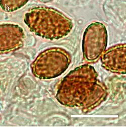 The ellipsoid to almond-shaped basidiospores are 9.5 to 11 by 6 to 7 micrometres (μm), averaging 10.2 by 6.1 μm. The spores are very warty, especially at their apices. The spores are moderately dextrinoid, meaning that they stain a reddish brown when tested with Melzer's reagent or Lugol's solution. The club-shaped basidia are 25 to 35 by 9 to 11 μm, sporting four sterigmata. The hyphae in the flesh of the gills are golden and are mainly smooth with a few spot-like encrustations. The pileipellis is rusty brown. It consists of more or less parallel hyphae that are 5 to 8 μm wide, densely encrusted with zebra-striped incrustations.[1]