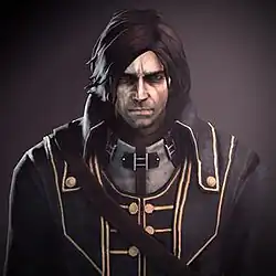 Corvo was initially not intended to be playable in Dishonored 2, but was included alongside his daughter, Emily Kaldwin, due to nostalgia for the character by the development team.[6] When designing his outfit for Dishonored 2, developer Sergei Kolesov wanted it to make sense for his position in society while reflecting his return to being an assassin.[7] They also gave him voice acting in the sequel, noting that they simply assumed aspects of the character in the first game. Corvo's personality was also made more assertive.[8] Giving him a voice also creative narrative contrast, according to Harvey Smith, to Emily, explaining that they have different experiences due to multiple factors.[9] He was voiced by Stephen Russell in Dishonored 2.[10][11]