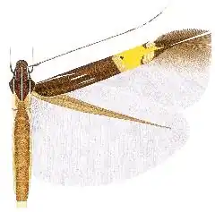 Male, female. Forewing length 4.7 mm. Head: frons shining ochreous-grey with greenish and reddish reflections, vertex and neck tufts shining dark brown with reddish gloss, laterally and medially lined white, collar shining dark brown with reddish gloss; labial palpus first segment very short, white, second segment four-fifths of the length of third, dark brown with white longitudinal lines laterally and ventrally, third segment white, lined brown laterally; scape dorsally dark brown with a white anterior line, ventrally white, antenna shining dark brown with a white line from base to beyond one-half, followed towards apex by approximately seven dark brown segments, four white, two dark brown, two white, ten dark brown and eight white segments at apex. Thorax and tegulae shining dark brown with reddish gloss, thorax with a white median line, tegulae lined white inwardly. Legs: shining dark brown with reddish gloss, femora of midleg and hindleg shining ochreous-grey with golden gloss, foreleg with a white line on tibia and tarsal segments one to three and five, tibia of midleg with white oblique basal and medial lines and a white apical ring, tarsal segments missing, tibia of hindleg with a very oblique silvery white line at base, a less oblique silvery white medial streak and a white apical ring, tarsal segment one with a white basal ring and white dorsal streak in the apical half, segments two to four dorsally white, segment five entirely white, spurs white dorsally, dark brown ventrally. Forewing shining dark brown with reddish gloss, four white lines in the basal area, a subcostal from base to one-quarter bending from costa in distal half, a short medial above fold, its centre under of the distal end of the subcostal, a subdorsal slightly longer than the medial, and a little further from base, a narrow dorsal from beyond base to one-fifth, a yellow transverse fascia beyond the middle, narrowing towards dorsum and with a short and narrow apical protrusion, bordered at the inner edge by a tubercular pale golden metallic fascia with some greenish reflection, and with a small subcostal patch of blackish brown scales on the outside, bordered at outer edge by two tubercular pale golden metallic costal and dorsal spots, the dorsal spot three times as large as the costal and more towards base, the costal and dorsal spots irregularly lined dark brown on the inside, a white costal streak from the costal spot, a shining white apical line from just beyond apical protrusion, cilia dark brown, paler towards dorsum. Hindwing shining greyish brown with reddish gloss, cilia brown. Underside: forewing shining greyish brown, the white apical line distinctly visible in the apical cilia, hindwing shining greyish brown. Abdomen dorsally shining dark brown with reddish gloss, laterally shining grey with greenish reflection, ventrally dark grey, in the middle yellowish white, segments banded shining white posteriorly, anal tuft ochreous-white.[1]