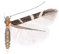 Male, female. Forewing length 2.9-3.3 mm. Head: frons shining greyish white with golden reflection, vertex and neck tufts shining dark bronze brown with golden reflection, laterally lined white, collar shining dark bronze brown; labial palpus first segment very short, white, second segment three-quarters of the length of third, dark brown with white longitudinal lines laterally and ventrally, third segment white, lined dark brown laterally; scape dorsally dark brown with a white anterior line, ventrally white, antenna shining dark brown, very vaguely annulate in middle. Thorax and tegulae shining dark bronze brown with golden reflection and reddish gloss. Legs: shining dark brown, femora of midleg and hindleg shining golden brown, foreleg with a white line on tibia and tarsal segments one and two, tibia of midleg with silver metallic oblique basal and medial lines with greenish reflection and a white apical ring, tarsal segments one, two and four with white apical rings, segment five entirely white, tibia of hindleg with silver metallic medial and subapical rings with greenish reflections and a white apical ring, tarsal segments one and two with silver metallic dorsal spots and apical rings, segments three and four with white apical rings and segment five entirely white, spurs shining dark brown, lined silver metallic. Forewing shining dark brown with reddish gloss, at one-fifth an irregular inwardly oblique silver to very pale golden metallic fascia, not reaching dorsum, a broad tubercular silver to very pale golden metallic fascia before one-half, perpendicular at dorsum and slightly bending toward base at costa, at three-fifths a tubercular silver to very pale golden outwardly oblique fascia, at costa edged by a short and broad white costal streak, between these last two fasciae, some yellow scales at dorsum, all three fasciae with strong violet reflection, the apical line as three silver metallic streaks with bluish reflection in the middle of the apical area and a narrow white line in the apical cilia, cilia dark brown, paler on dorsum towards base. Hindwing shining dark greyish brown, cilia dark brown. Underside: forewing shining dark brown with the white costal streak indistinctly and the white apical line distinctly visible, hindwing dark greyish brown. Abdomen dorsally shining dark brown with reddish gloss, laterally with golden reflection, ventrally dark brown with strong golden reflection, segments broadly banded shining white posteriorly, anal tuft large, shining golden grey, dark grey in female.[1]