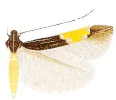 Male. Forewing length 3.8 mm. Head: frons shining ochreous-white with greenish and reddish reflections, vertex and neck tufts dark bronze brown with reddish gloss, laterally and medially lined white, collar bronze brown; labial palpus first segment very short, white, second segment four-fifths of the length of third, brown with white longitudinal lines laterally and ventrally, third segment white, lined brown laterally; scape dark brown with white anterior and dorsal lines, white ventrally, antenna shining dark brown with a white line from base to just before one-half and changing into an interrupted line to three-fifths, followed towards apex by an annulated section of eight segments, seven dark brown, four white, two dark brown, two white, ten dark brown, three white and five dark brown segments at apex. Thorax dark bronze brown with reddish gloss and a white median line; tegulae bronze brown, inwardly lined white. Legs: ochreous-grey, femora of midleg and hindleg shining pale ochreous, foreleg with a white line on tibia and tarsal segments one to three and five, tibia of midleg with white oblique basal and medial lines and a white apical ring, tarsal segments one to three white except at base, segment five entirely white, tibia of hindleg with a very oblique white line from base to one-third, a second white lateral line nearly from base to spurs, from there towards dorsum as an oblique line to two-thirds, a short subapical white streak just before the white apical ring, first tarsal segment with a white basal and an ochreous-white apical ring, tarsal segments two to four with indistinct ochreous apical rings, tarsal segment five ochreous-white, spurs ochreous-white, ventrally with a dark grey streak. Forewing dark bronze brown with reddish gloss, five white lines in the basal area, a costal from one-quarter to the transverse fascia, a subcostal from base to two-fifths, slightly bending from costa, a short and straight medial above fold from one-quarter to near the transverse fascia, a slightly shorter subdorsal below fold, from one-third to just beyond the medial, a broad dorsal nearly from base to one-third and with some greenish and reddish reflections, a broad yellow transverse fascia beyond the middle, narrowed towards dorsum, bordered at the inner edge by two silver metallic, tubercular subcostal and subdorsal spots, the subdorsal spot further from base and slightly larger than the subcostal, bordered at the outer edge by two similarly coloured costal and dorsal spots, the dorsal spot twice as large as the costal and more towards base, the tubercular spots have purplish and greenish reflections, a narrow whitish costal streak apical from the outer costal spot and a shining white apical line inwardly not connected to the transverse fascia and ending in the cilia just before apex, cilia bronze brown around apex, brownish grey towards dorsum. Hindwing shining pale brownish grey, cilia brownish grey. Underside: forewing shining pale greyish brown, the white apical line indistinctly visible, hindwing greyish white, pale brownish grey at costa. Abdomen dorsally yellow, first segment yellowish white, laterally shining grey, ventrally shining white, in middle yellowish white, segments banded shining yellowish white posteriorly, anal tuft shining white.[1]