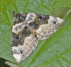 Their wingspan is between 20 and 29 mm and the length of their forewings is between 13 and 15 mm.[3] The ground colour of the forewings is creamy white to bright white. The base and midfield are coloured black to blue black. The latter is crossed by two bright lines. In the midfield band is a deep, jagged spot. In the bright areas between the basal area and the midfield as well as in the marginal field are grey or black spots of varying degrees. The hindwings are whitish and show a small black middle spot.[4][5][6][7]