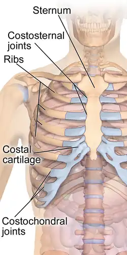 - ^ a b c Kurz J (2019). Costosternal Syndrome. Essentials of physical medicine and rehabilitation E-Book. Walter R. Frontera, J. K. Silver, Thomas D. Rizzo (4th ed.). Philadelphia. pp. 549–54. ISBN 978-0-323-54947-9. OCLC 1081423365.