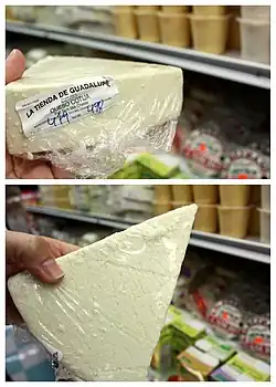 Cotija (/koʊˈtiːxə/ koh-TEE-khə, Spanish pronunciation: [koˈtixa]) is an aged Mexican cheese made from cow's milk and named after the town of Cotija, Michoacán.[1] White in color and firm in texture, its flavor is salty and milky. "Young" (or fresher) cotija cheese has been described as akin to a mild feta, while aged (añejo) cotija is more comparable in flavor to hard, aged cheeses like Parmesan. Cotija softens when exposed to heat, but does not melt.[2] Made between the summer and fall seasons, this cheese is made with milk from local cattle and is salted before the fermentation process. The manufacturing processes of most cheeses in Mexico are still rustic and traditional, similar to the manufacturing process that was used upon its invention. Due to the traditional means of production of dairy products in Mexico some dairy products have a conflicting shelf-life which leads to earlier expiration. However, some studies suggest components in the fermentation of Cotija cheese are natural preservatives that can extend the shelf-life of Cotija and other food products as well.[3]