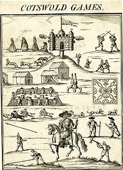 ![]() Image from 1636 depicting the Cotswold Games. Robert Dover, founder of the games, is on horseback, carrying a wand.[1] | |