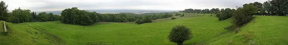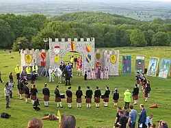 The games took place in a natural amphitheatre on what is known today as Dover's Hill, then called Kingcombe Plain, above the town of Chipping Campden, in Gloucestershire.[7] They were held on the Thursday and Friday of Whit-Week, or the week of Whitsun, which normally fell between mid-May and mid-June. Dover presided over the games on horseback, dressed ceremonially in a coat, hat, feather and ruff, donated by King James. Horses and men were decorated with Dover's favours, yellow ribbons pinned to a hat or worn around the arm, leg, or neck.[20] Tents were erected for the gentry, who came from the surrounding counties of Gloucestershire, Oxfordshire and Worcestershire, and food was supplied in abundance.[1] The poet Nicholas Wallington wrote that:[21]