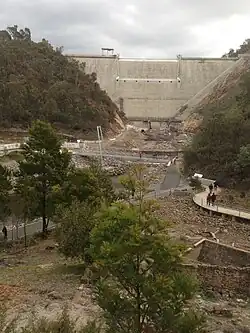 Completed in 2013, the enlarged Cotter Dam comprises a new 87-metre (285 ft) high roller compacted concrete dam wall built downstream from the old 26-metre (85 ft) high dam wall, along with two auxiliary embankment dam walls along low-lying adjoining valleys. Constructed on rock foundations by an Abigroup / John Holland joint venture, with engineering design by GHD, the main dam wall is 330 metres (1,080 ft) long, with the two rockfill embankments 340 metres (1,120 ft) and 300 metres (980 ft) long and 15 metres (49 ft) and 18 metres (59 ft) high respectively, both with internal earthen cores.[1] The enlarged dam walls increased the storage capacity of the Cotter Reservoir from the previous 3.9 gigalitres (860,000,000 imp gal; 1.0×109 US gal) to 78 gigalitres (1.7×1010 imp gal; 2.1×1010 US gal).[3]