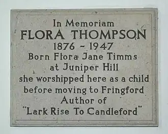 The author Flora Thompson[9] (1876–1947) grew up in Juniper Hill and was a pupil at Cottisford School. She wrote the Lark Rise to Candleford trilogy of novels, in which she modelled the village of "Fordlow" on Cottisford.[2]