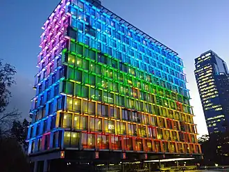 The outside of the building was fitted with over 22,000 LED lights which was officially turned on on 7 April 2010. The LEDs located on the roof, 'T' window structures, and bulkheads are able to be individually computer controlled and coloured. The lights were installed at a cost of $1.08 million.[50]