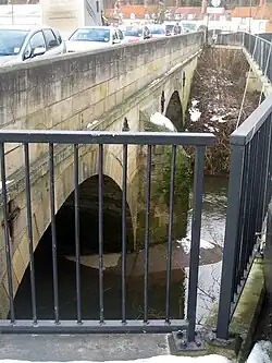 A bridge crossing the River Derwent at this location was recorded as being repaired in 1332. It was repaired at the cost of £100 in 1612, and in 1736 its parapets were repaired.[1] The current bridge was constructed in about 1760, to a design probably by John Carr.[2] It was widened in 1925, when a footpath was added,[3] but later in the century a separate footbridge was constructed alongside.[4] The bridge was grade II listed in 1974.[2]