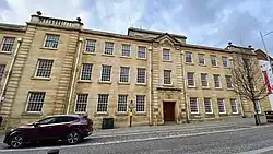 As the county council's responsibilities grew, it needed more office space than was available in County Hall. It acquired a former gaol (built 1791–1794) immediately south-east of the Sessions Room and County Hall, and converted that to be offices.[4] In 1939 the council built a large neo-Georgian office building to the east of the old gaol, linked to the older buildings by corridors to the rear. The new building was called County Offices and had its main frontage onto Guildhall Road. It was designed by the county architect, George Henry Lewin, and was faced in Ketton stone. The county council was granted a coat of arms whilst the building was under construction, and the arms were carved into the stonework above the main doorway. The outbreak of the Second World War meant that no official opening ceremony was held for the County Offices.[5]