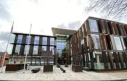 The county council's administrative responsibilities continued to grow, and by the early 21st century its offices were spread across some twelve buildings around the town. In 2013, it decided to procure a single administration centre in which council officers and their departments would be co-located on a derelict site just south of County Hall. The new building was named "One Angel Square".[6] The building was designed by BDP, built by Galliford Try[7] at a cost of £53 million and officially opened by the Secretary of State for Housing, Communities and Local Government, Sajid Javid, in October 2017.[8][9] The county council subsequently announced the sale and lease back of One Angel Square to Canada Life Investments, in order to raise funds for the provision of services, in February 2018.[10][11][12]