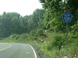 County Route 106 (CR 106) is a 7.8-mile (12.6 km) east–west county route in Rockland County, New York, in the United States. It serves as an eastward continuation of Kanawauke Road (former Orange CR 106), extending from the Orange County line to U.S. Route 9W (US 9W) and US 202 in Stony Point via Harriman State Park. CR 106 intersects with several county highways in Rockland County along the way. The route was only one of two in Rockland County to keep its numbering from Orange County, with the other being CR 72. CR 106 had one spur route, CR 106A, which was recently decommissioned.