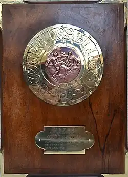 The 1916 Coupe des Alliés was the first trophy in the history of Stade Rennais, but it took over a century to reach the club's museum.[14] The trophy was initially presumed lost until it was finally found in 1980 in Rouen, at a garage sale, by Guy Morat, a retired banker and an amateur antique dealer.[14] In 2020, a few months after the club launched its museum, the Roazhon Park legends gallery, Morat gave the Coupe des Alliés to his nephew, who then presented it to the club's president Jacques Delanöe, who had recently launched an appeal to recover the club's first two Coupe de France (1965 and 1971), which was successful since the club was able to get its hands on both trophies again.[14] Rennes' triumphant campaign at the 2018–19 Coupe de France meant that the club went from zero trophies in the display to now having four.[14]