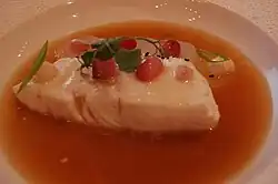 Court-bouillon or court bouillon (in Louisiana, pronounced coo-bee-yon)[1] is a quickly-cooked broth used for poaching other foods, most commonly fish or seafood. It is also sometimes used for poaching vegetables, eggs, sweetbreads, cockscombs, and delicate meats. It includes seasonings and salt but lacks animal gelatin.
