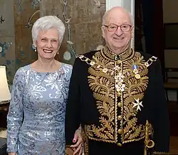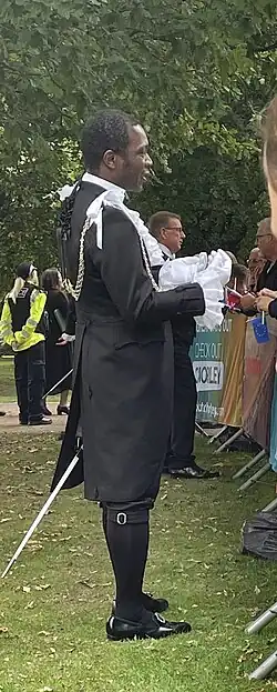 In the twenty-first century 'old style' velvet Court Dress has become the distinctive customary garb of male High Sheriffs (while female High Sheriffs often wear outfits inspired by this form of dress).[21] The wearing of this style of Court Dress by High Sheriffs is described as 'a long-established custom' and the High Sheriffs’ Association encourages its use 'to uphold the dignity and recognition of the office during official engagements'.[24] 'New style' velvet Court Dress is also occasionally worn.[25]