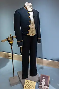 In 1859, however, Queen Victoria conferred 'on Her Majesty's Civil Servants in the Colonies, the right to wear the Civil Uniform prescribed for Her Majesty's Servants in Great Britain'.[37] Thenceforward, officials and civil servants of various ranks began to wear regular court uniform (as detailed above).[2] 1st class uniform was reserved at this time for Governors; Lieutenant Governors and Administrators could wear 2nd class uniform, executive council members 3rd class, heads of department 4th class and deputy heads of department 5th class.[37] Indian members of the Indian Civil Service were likewise entitled to wear civil uniform (with the option of a turban or pagri replacing the cocked hat); alternatively they could wear the national dress which they were accustomed to use on ceremonial occasions (or they could wear a blue coat buttoning from the neck to below the waist, with white trousers or pyjamas, and the native head-dress).[1]