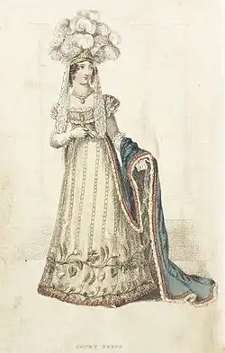 An illustration from the Gallery of Fashion, 1795: note feathers, train and lappets (behind).