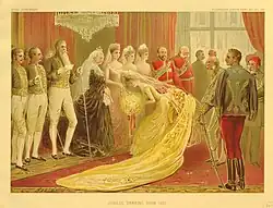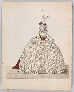 From time to time, reminders were issued as to the correct form: for example, in 1834 it was stated in the London Gazette that 'some Ladies having appeared at Her Majesty's Drawing-Rooms in hats and feathers, and turbans and feathers, and such head dresses being contrary to Court etiquette; notice is hereby given, that all Ladies attending the Queen's Drawing-Rooms must appear in feathers and lappets, in conformity with the established order'.[4] Coloured feathers were not allowed; but 'in deep mourning black feathers may be worn'.[5] By the 1870s 'white veils' were allowed to be worn, as an alternative to lappets.