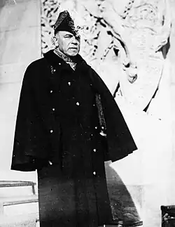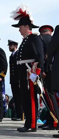 Over time, the number of colonial officials who were permitted to wear civil uniform grew, and the range of offices entitled to the higher classes of uniform expanded (in the Dominions, for example, cabinet ministers would wear 2nd class uniform and the Prime Minister, if a member of the Privy Council, would wear 1st class).[37] In 1910 King George V therefore decided to reinstate the more distinctive uniform for Governors and Governors General (which was again based on the uniform of a Lord Lieutenant, but with the colours reversed).[38] For Governors, it consisted of a plain blue coat with scarlet collar and cuffs (embroidered in silver), silver epaulettes and trimmings, and a plumed hat. Governors General wore aiguillettes in addition. This uniform (in slightly simplified form) is still occasionally worn by Governors of British Overseas Territories today.