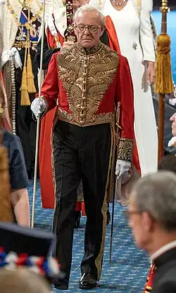 Various parliamentary officials (both male and female) wear cloth court dress on state occasions, as seen here in 2024.