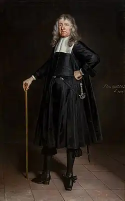 In October 1666 King Charles II published in Council new regulations for the correct form of dress to be worn by gentlemen at Court. Court fashion at that time had grown very extravagant: writing in 1661, John Evelyn described a gentleman walking through Westminster Hall as 'a fine silken thing [...] that had as much ribbon about him as would have plundered six shops and set up twenty country pedlars; all his body was drest like a May-pole, or a Tom o' Bedlam's cap'.[12] According to Samuel Pepys, the King's new sartorial directive was intended 'to teach the nobility thrift, and will do good'.[13]