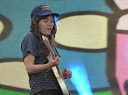 Barnett plays left-handed, using mostly left-handed guitars with standard tuning and string order for left-handed players (low strings at the top, high strings at the bottom).[10] She occasionally plays right-handed guitars flipped upside down, but does not prefer it. She learned to play on acoustic guitars, and developed her own method of fingerstyle guitar because she disliked the sound of a pick; she later transferred this playing style to the electric guitar. She is capable of using a pick and claims she could probably play better with one, but prefers to play using her fingers, strumming with both her thumb and index finger on rhythm parts and using her index finger where she would otherwise use a pick for lead parts. She prefers to play in standard tuning, but has used open G tuning for slide guitar.[62]