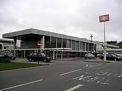 In the early 1960s, during electrification of the line, both bridges were widened, and the old station finally demolished and re-built, this time with room for four platforms instead of two. At the time it was demolished in 1960, some parts of the old station were 120 years old. The new station comprises a two-storey height booking hall with reinforced concrete frame, linked across an adjoining platform by a bridge to an island platform and a single sided platform. It was built to the designs of W R Headley, Regional Architect of the London Midland Region of British Railways and Derrick Shorten, the project architect.[1] It was formally reopened on 1 May 1962.[16][17][18] In 1995 it became a Grade II listed building.[1][19][20]