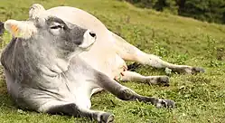Trauma or illness may also result in a cow unable to rise to its feet. Such animals are sometimes called "downers." Sometimes this occurs as a result of muscle and nerve damage from calving or a disease such as mastitis.[26] Leg injuries, muscle tears, or a massive infection of some sort may also be causes.[27] Downer cows are encouraged to get to their feet and have a much greater chance of recovery if they do. If unable to rise, some have survived—with medical care—as long as 14 days and were ultimately able to get back on their feet. Appropriate medical treatment for a downer cow to prevent further injury includes rolling from one side to the other every three hours, careful and frequent feeding of small amounts of fodder, and access to clean water.[26]