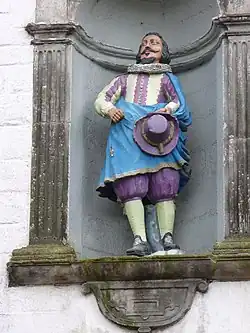 John Cowane's brother, Alexander, acted as his executor and signed the hospital's Deed of Foundation on 13 February 1637.[7] The land, sited adjacent to the Church of the Holy Rude in a prestigious part of the town, was transferred to the Town Council, and plans for the new building were commissioned from the royal master-mason John Mylne. As with Mylne's other architectural work, the design shows contemporary Dutch influences, notably the form of the bell tower and crow-step gables. In a niche on the tower is a statue of John Cowane, sculpted by Mylne and William Ayton.[1] The statue, locally known as "Auld Staneybreeks" (old stone-trousers), is said to come to life and dance in the courtyard at Hogmanay (New Year).[8]
