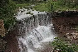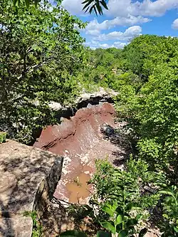 West of Dexter, KS, Cowley County Fishing Lake is positioned just off of Highway 166. This fishing lake is the home of the Cowley County Waterfall, which can be visited following the road to the northwest side of the property.[9] However, in recent years (as of 2021) the severe drought has caused the waterfall to stop flowing. It will likely continue if the area receives enough precipitation and ends the drought.