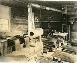 As winter approached in 1874, Cowley's family was able to build a log cabin with assistance of the Spokane people, the first permanent structure built in what is now Cowley Park. The original 16-foot-by-24-foot structure was composed of two rooms, with an attic above and a kitchen added on.[1] In addition to helping provide logs for construction, the Spokane people brought salmon, venison and flour for the Cowley family.[4] A Spokane elder brought milk for the Cowley children on a daily basis as well.[1] The first school in the city, which served both native Spokane children and those of the new white settlers, was housed in the original Cowley Cabin. School began on January 1, 1875, with five girls and one boy in attendance.[4]