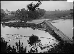 From 1860, there was significant industrial development in the area, this included the Willesden Works which produced pesticide, sulphuric acid for the manufacture of fertiliser and artificial stone.[9] In 1865, a brick factory, Caledonian Brickworks, was established by John Leckie, and products were shipped via Coxs Creek to Auckland.[9] In 1874, the Warnock brothers set up the Warnock Soap and Candle Works on the southern side of Richmond Rd, next to Coxs Creek.[10] In 1899, Cashmore Brothers established a steam-powered sawmill beside the creek below Coxs Bridge Rd (later renamed West End Rd).[11] The bay and creek were used for the transport of logs and timber. Despite strong protests from the growing local population, the mill operated until 1920, when it accidentally burnt down, leaving sawdust and timber smoldering for over a year.[11][12]