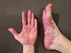 - ^ Ramirez-Fort MK, Downing C, Doan HQ, Benoist F, Oberste MS, Khan F, Tyring SK (August 2014). "Coxsackievirus A6 associated hand, foot and mouth disease in adults: clinical presentation and review of the literature". Journal of Clinical Virology. 60 (4): 381–6. doi:10.1016/j.jcv.2014.04.023. PMID 24932735.