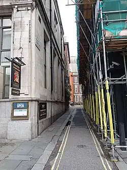 The entrance to the Court is a single-track road which is said to have hastened the creation of the Westminster Paving Act when Speaker of the House of Commons, Arthur Onslow's carriage was involved in an accident on entering the Court.[7] On the north side of the entrance is part of the South African High Commission,[8] Walkers of Whitehall public house,[9] and a telephone exchange that replaced numbers 1 and 2.[6] On the south side of the entrance is the grade II listed 25 Whitehall (Craig's Court House), which runs from Whitehall and into the western side of the Court.[10]