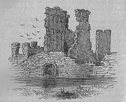 The ruins stand upon a knoll rising out of a plateau, between what appears to have been two marshes or lochans, and the ditches were originally cut between them. One ditch cuts the ridge 117m NE of the castle to form an outer bailey. The castle would have been effectively isolated from the 'mainland', and a significant barrier raised by the water to any potential besiegers at the period when the use of gunpowder was unknown. Two crumbling gables, portions of walls, and shreds of battlements remain, and in the 19th century several underground vaulted chambers survived, although partly filled with rubbish, and home to foxes and bats.[14] The entrance to the castle was at the south-west side by a drawbridge,[15] of which the abutment still survives.[16] The entrance pend or arched passage had a circular watch-tower or bastion to defend it. Within the closing wall was a courtyard surrounded by buildings, and from this courtyard there was an entrance into the great hall, long blocked up.[17]